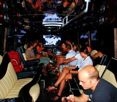 Парти буса е оборудван с вграден бар с чаши и ледарки, аудиосистема, телевизор, DVD, ефектно оптично и LED осветление, кожен салон, преграда между шофьора и пътниците, климатроник и интерком. Към целият този лукс може да добавим декорация с цветя, бонбони и шампанско - така предоставяме на Вас - нашите клиенти, един пълен завършек на приказната Ви разходка!